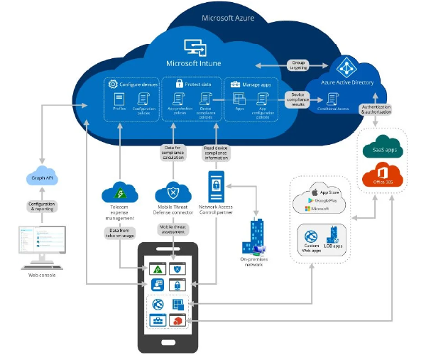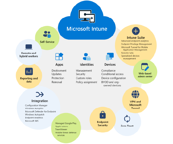 una solución de administración de puntos de conexión basada en la nube. Intune administra el acceso de los usuarios a los recursos de la organización y simplifica la administración de aplicaciones y dispositivos. Protege los datos en cualquier dispositivo y permite a los empleados trabajar desde cualquier lugar. Intune se integra con otros servicios de Microsoft, como Microsoft 365 y Defender para punto de conexión.